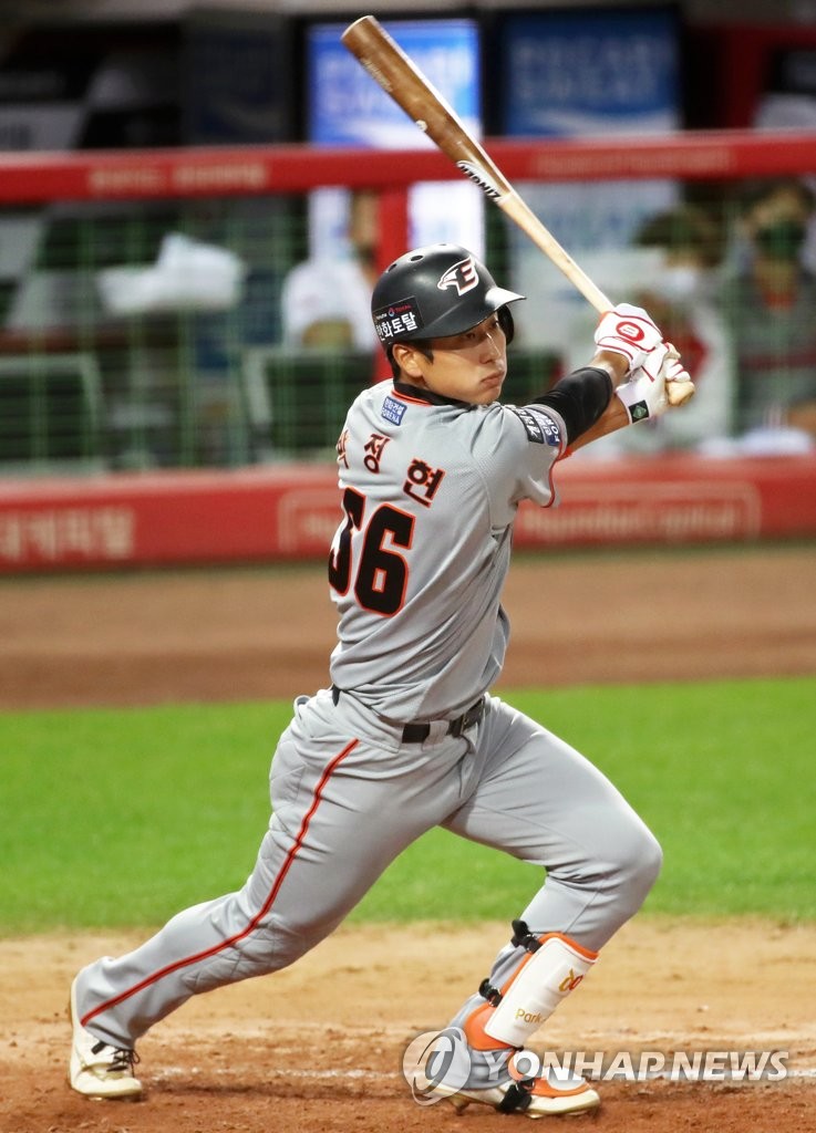 | ▲ In this file photo from Oct. 8, 2020, Park Jung-hyun of the Hanwha Eagles hits an RBI double against the Kia Tigers in the top of the third inning of a Korea Baseball Organization regular season game at Gwangju-Kia Champions Field in Gwangju, 330 kilometers south of Seoul. (Yonhap) |