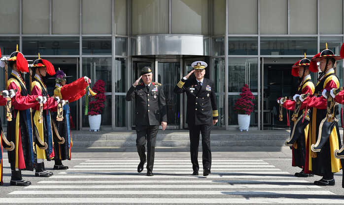South Korean Joint Chiefs of Staff (JCS) Chairman Adm. Kim Myung-soo (R) and Gen. Metin Gurak, chief of Turkey's General Staff, attend a welcoming ceremony for Gurak at the JCS' headquarters in Seoul on April 28, 2025, in this photo provided by the JCS. (PHOTO NOT FOR SALE) (Yonhap)