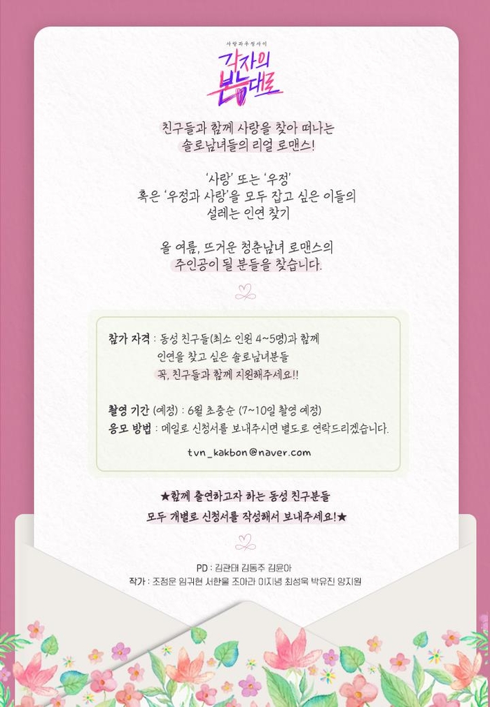 ▲ tvN '각자의 본능대로' 출연진 모집 = tvN 새 연애 프로그램 '각자의 본능대로'가 출연진을 모집한다.