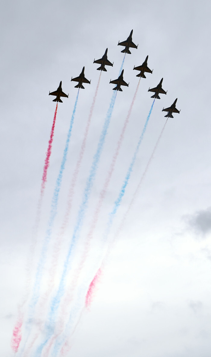 The Air Force's Black Eagles aerobatic team performs with colored smoke trails during a ceremony marking Armed Forces Day over Seoul Air Base in Seongnam, just south of Seoul, on Oct. 1, 2024. (Yonhap)