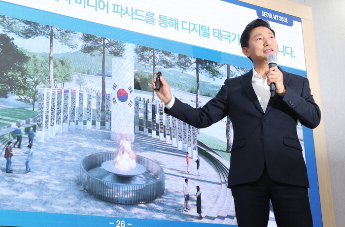 Seoul Mayor Oh Se-hoon gives a briefing on the city government's plan to build a national symbolic space at Gwanghwamun Square on July 11, 2024. (Yonhap)