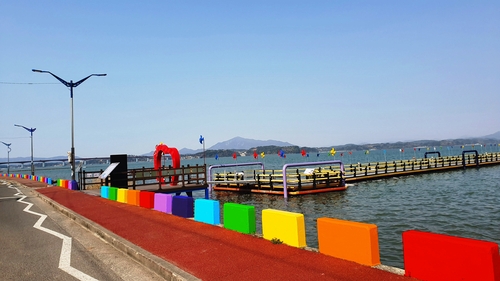 (사천=연합뉴스) 지성호 기자 = 경남 사천시의 용현면 종포마을∼남양동 미룡마을 6.2km 구간 '무지갯빛 해안도로'가 포토존 명소로 입소문이 나면서 관광지로 떠오르고 있다.