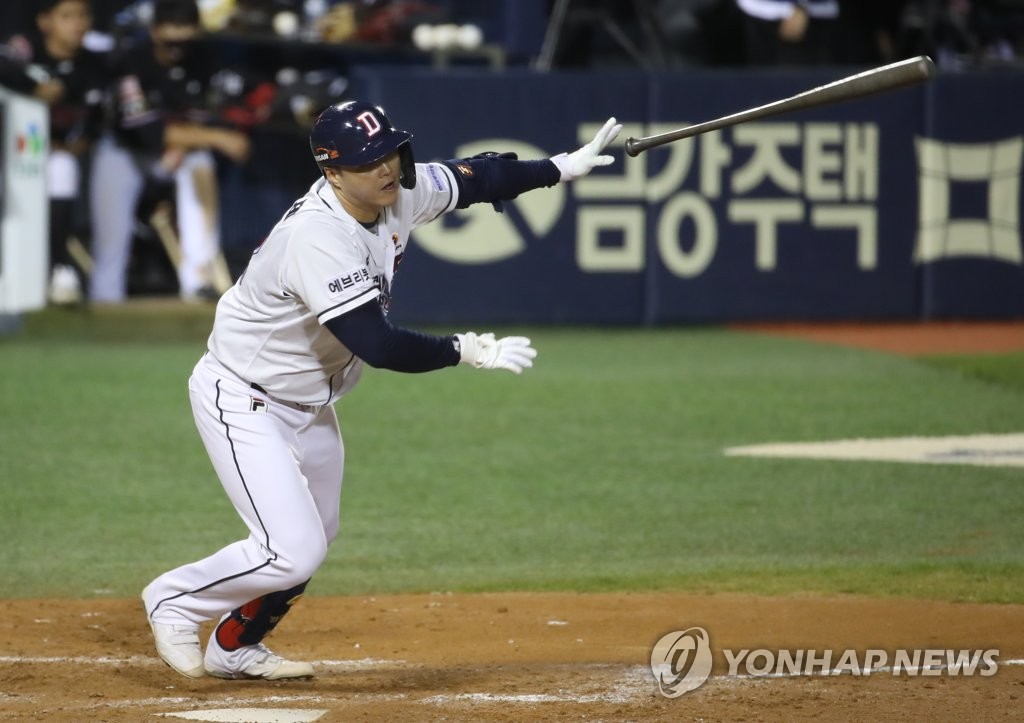 | ▲  In this file photo from Oct. 12, 2021, Choi Yong-je of the Doosan Bears hits a single against the KT Wiz in the bottom of the seventh inning of a Korea Baseball Organization regular season game at Jamsil Baseball Stadium in Seoul. (Yonhap) |