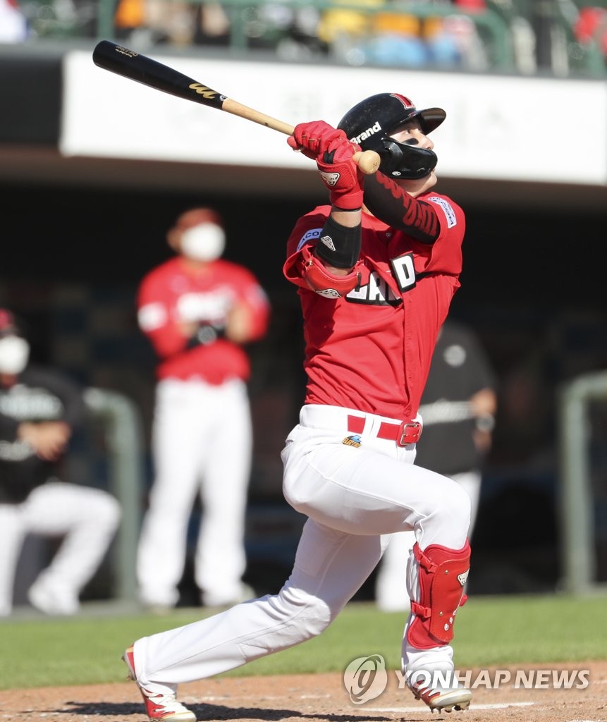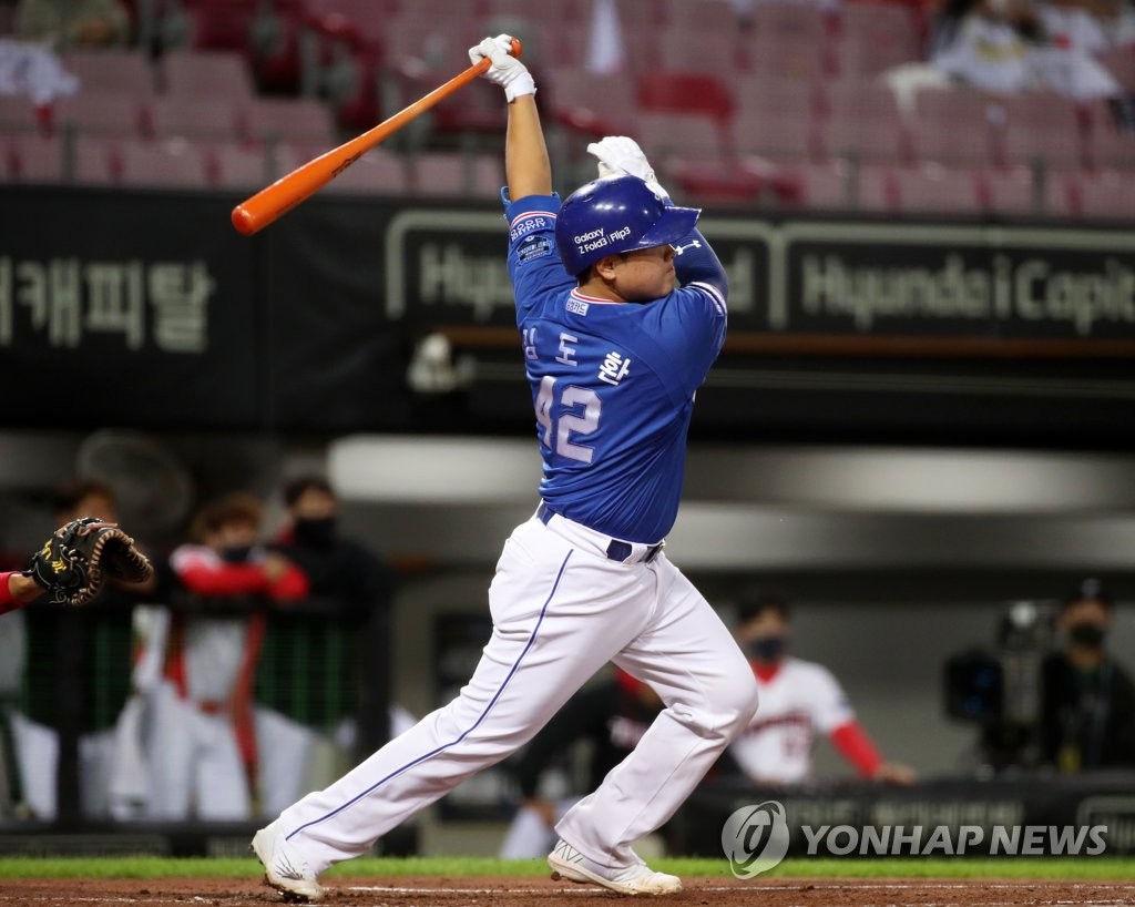 | ▲  In this file photo from Oct. 11, 2021, Kang Baek-ho of the KT Wiz hits a two-run single against the LG Twins in the top of the sixth inning of a Korea Baseball Organization regular season game at Jamsil Baseball Stadium in Seoul. (Yonhap) |