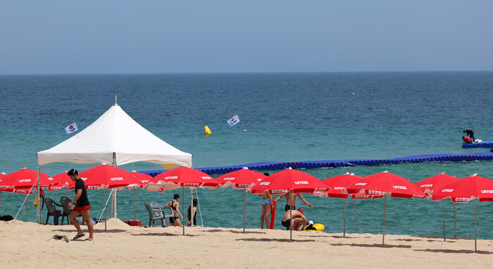 Beach umbrellas are set up at Gyeongpo Beach in the eastern coastal city of Gangneung on July 11, 2024. (Yonhap)