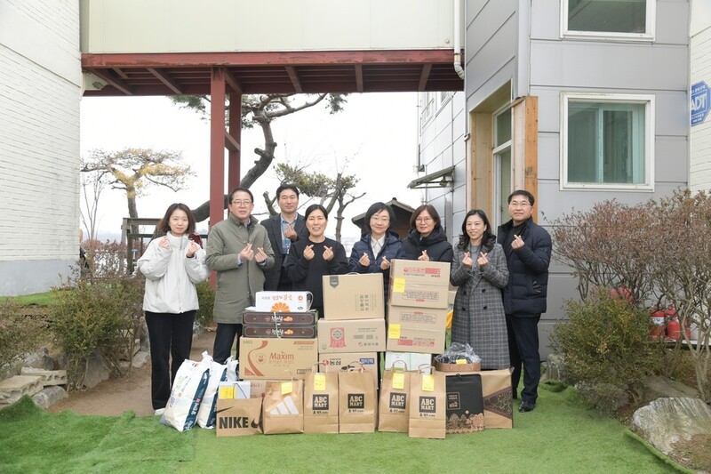 | ▲ 7일 충북 청주시 아동보호시설 해오름집에서 오유경 식품의약품안전처장 등이 위문품을 전하고 있다. [식품의약품안전처 제공] |
