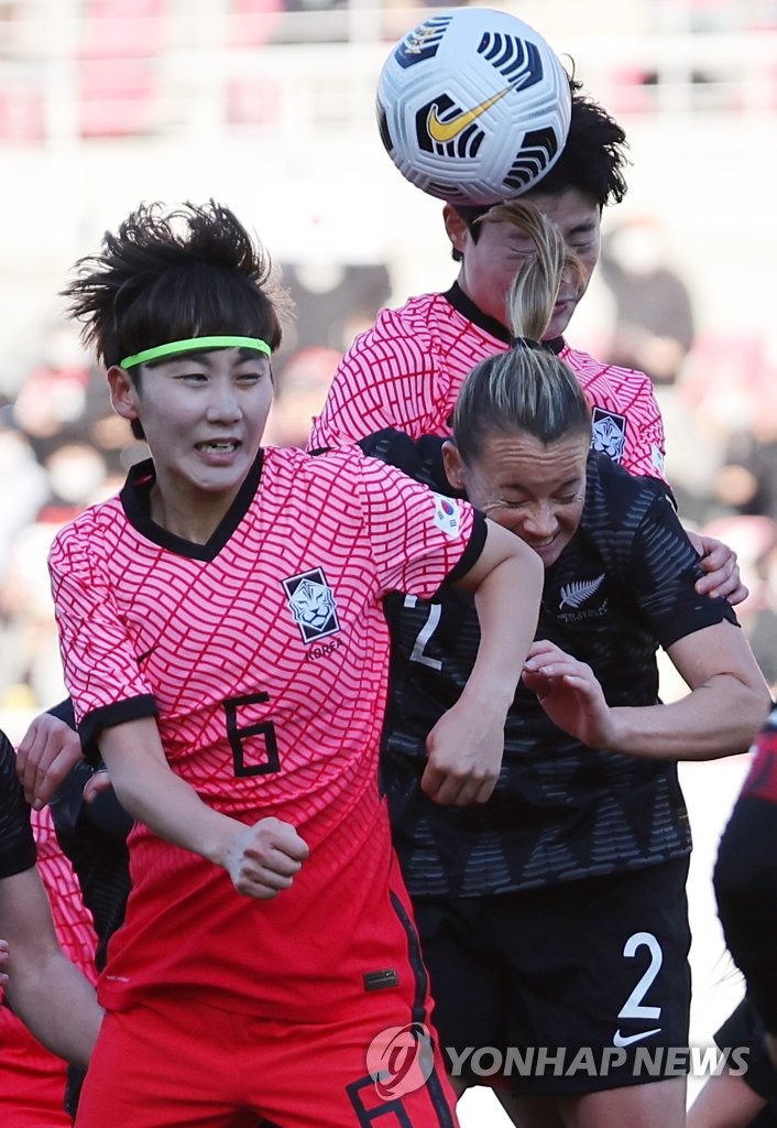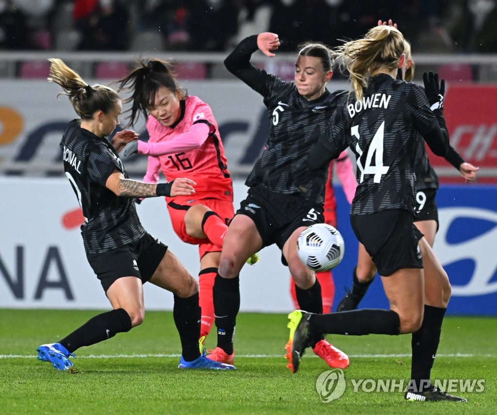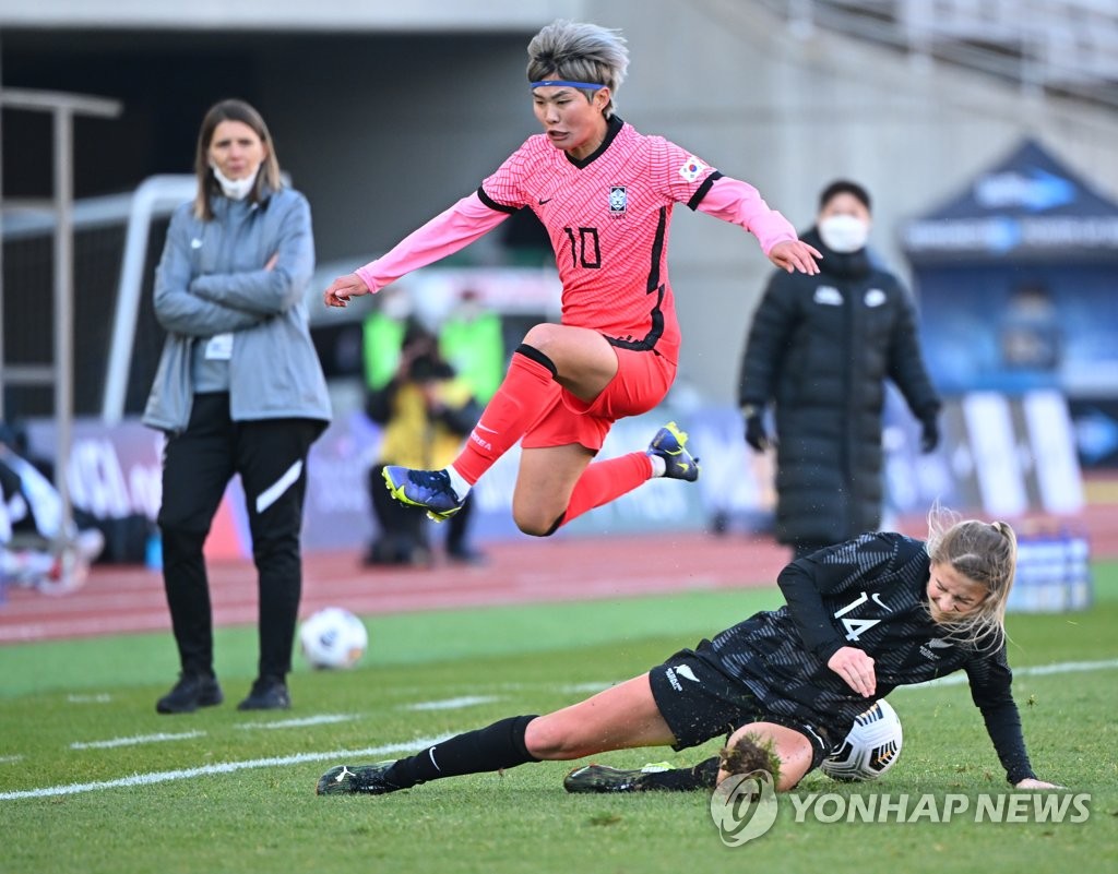 | ▲ Lim Seon-joo of South Korea (L) and Ria Percival of New Zealand (R) battle for the ball during the teams' friendly football match at Goyang Stadium in Goyang, Gyeonggi Province, on Nov. 27, 2021. (Yonhap) |