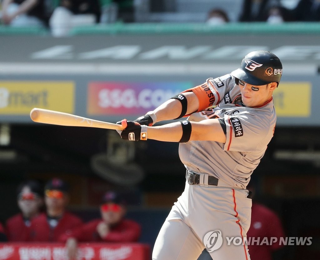 | ▲ In this file photo from May 5, 2022, Ha Ju-suk of the Hanwha Eagles hits an RBI single against the SSG Landers in the top of the fourth inning of a Korea Baseball Organization regular season game at Incheon SSG Landers Field in the western city of Incheon. (Yonhap) |