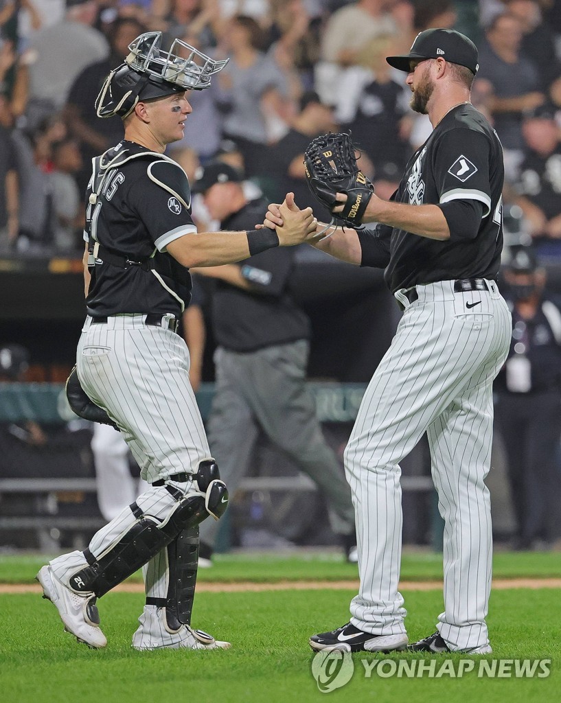 | ▲  In this Getty Images photo, Chicago White Sox reliever Mike Wright (R) shakes hands with his catcher Zack Collins after closing out a 9-0 win over the Oakland Athletics in a Major League Baseball regular season game at Guaranteed Rate Field in Chicago on Aug. 17, 2021. (Yonhap) |