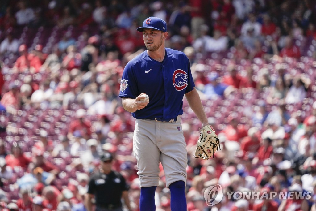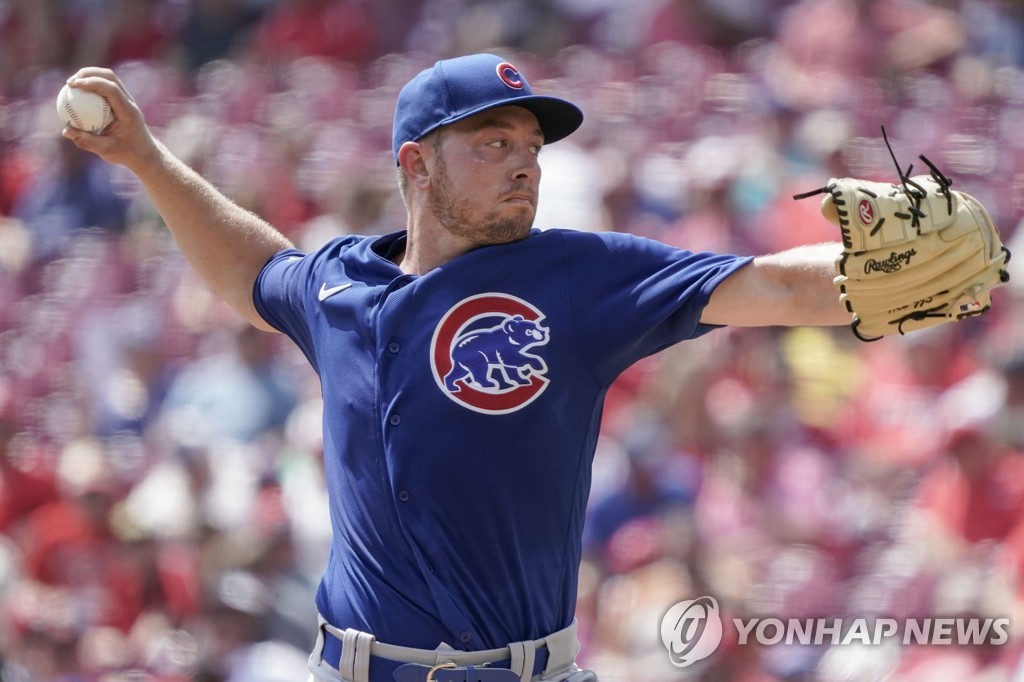 | ▲  In this Associated Press photo, Adrian Sampson of the Chicago Cubs pitches against the Cincinnati Reds in the bottom of the first inning of a Major League Baseball regular season game at Great American Ball Park in Cincinnati on Aug. 18, 2021. (Yonhap) |
