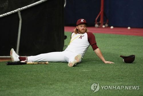| ▲  In this file photo from April 17, 2020, Taylor Motter of the Kiwoom Heroes takes a break during practice at Gocheok Sky Dome in Seoul. (Yonhap) |