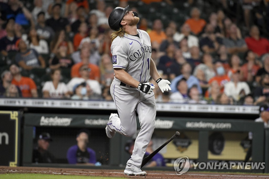 | ▲  In this Associated Press photo, Taylor Motter of the Colorado Rockies hits a pop fly during the top of the second inning a Major League Baseball regular season game against the Houston Astros at Minute Maid Park in Houston on Aug. 10, 2021. (Yonhap) |