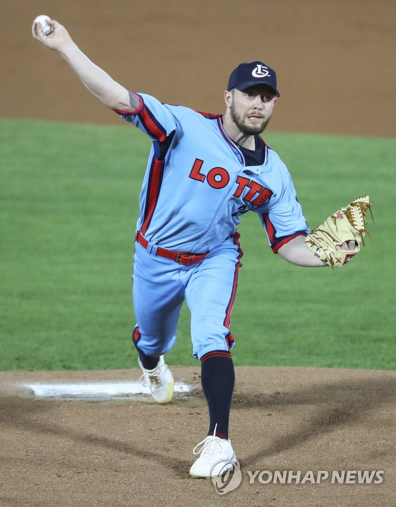 | ▲  In this file photo from Oct. 14, 2020, Adrian Sampson of the Lotte Giants pitches against the LG Twins in the top of the first inning of a Korea Baseball Organization regular season game at Sajik Stadium in Busan, 450 kilometers southeast of Seoul. (Yonhap) |