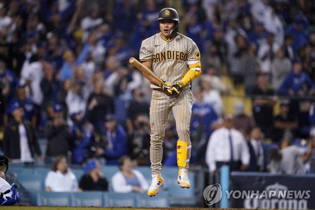 Kim is the only South Korean player left in the ongoing postseason. He batted 2-for-8 with four runs scored and four walks in San Diego's three-game victory over the New York Mets in the National League Wild Card Series over the weekend.