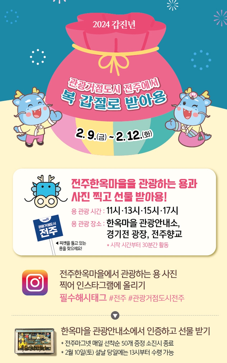 시 관계자는 "용의 해를 맞아 관광거점도시 전주를 재미있게 홍보하고자 이벤트를 계획했다"며 "전주를 찾는 귀성객과 관광객에게 즐거운 체험 거리가 되길 바란다"고 말했다.