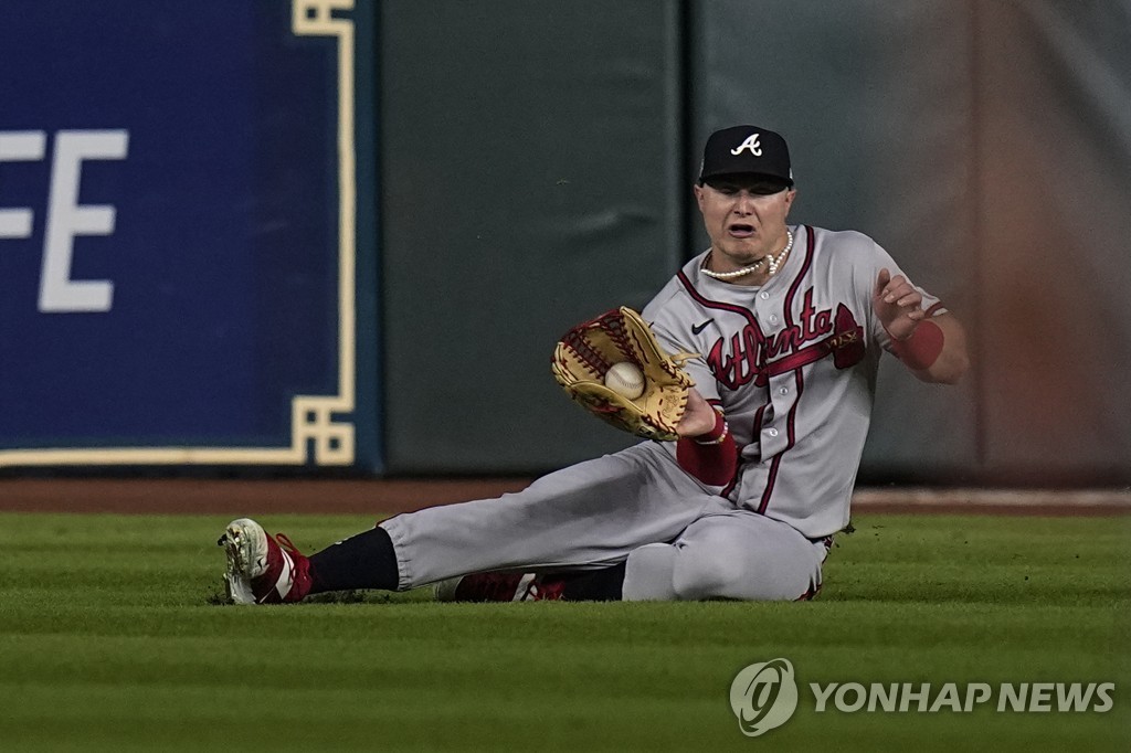 | ▲ 어려운 공을 잡아내는 피더슨 (휴스턴 AP=연합뉴스) 애틀랜타 브레이브스 우익수 족 피더슨이 3일(한국시간) 미국 텍사스주 휴스턴 미닛메이드파크에서 열린 휴스턴 애스트로스와의 월드시리즈 6차전, 7회말 수비 때 카일 터커의 타구를 잡아내고 있다. |