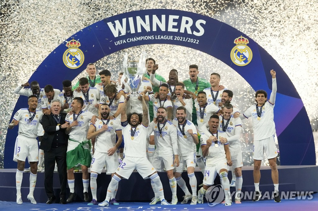 | ▲ 레알 마드리드, 챔피언스리그 통산 14번째 우승 (생드니 AP=연합뉴스) 스페인 프로축구 레알 마드리드 선수들이 28일(현지시간) 프랑스 생드니의 스타드 드 프랑스에서 열린 2021-2022 유럽축구연맹(UEFA) 챔피언스리그(UCL) 결승전에서 리버풀(잉글랜드)을 꺾고 우승컵 '빅이어'를 들어 올리며 환호하고 있다. UCL 역대 최다 우승팀인 레알 마드리드는 4년 만에 통산 14번째로 우승컵을 차지하며 이 기록을 이어갔다. 2022.5.29 leekm@yna.co.kr |