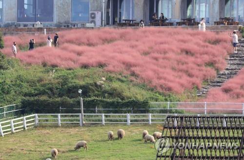 | ▲ 제주 핑크뮬리 절정 (제주=연합뉴스) 박지호 기자 = 26일 오전 제주시 애월읍 봉성리 새별오름 인근의 한 카페를 찾은 관광객이 핑크뮬리 정원에서 가을 정취를 즐기고 있다. 2021.9.26 |