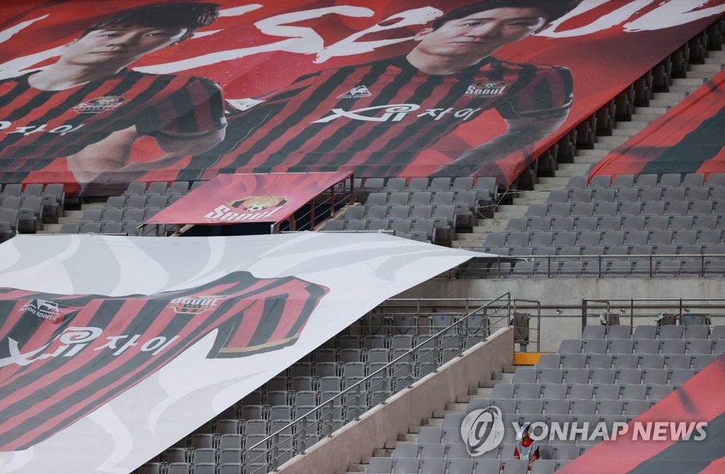 | ▲ This file photo from Aug. 18, 2021, shows an empty Seoul World Cup Stadium, with seats covered in banners, during a K League 1 match between FC Seoul and Jeju United. (Yonhap) |