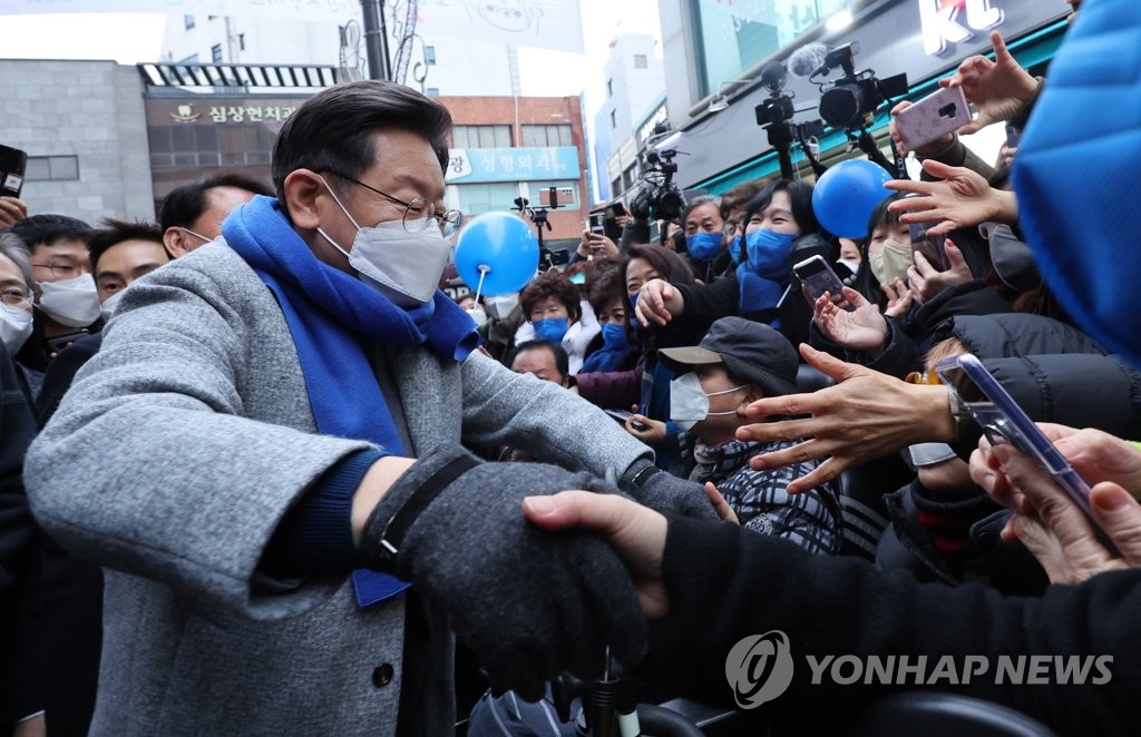 | ▲ 춘천 시민과 인사하는 이재명 대선후보 (춘천=연합뉴스) 백승렬 기자 = 더불어민주당 이재명 대선후보가 15일 강원도 춘천시 명동거리를 방문, 시민들과 인사하고 있다. 2022.1.15 srbaek@yna.co.kr |
