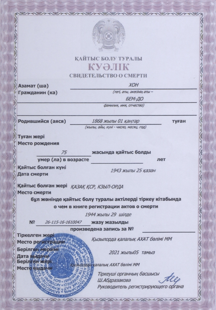 카자흐스탄 정부가 발급한 사망 증명서는 장군의 이름과 출생일(1868년 1월 1일·1868년 8월 27일의 오기), 사망일(1943년 10월 25일), 사망 장소(카자흐스탄 크즐오르다)가 카자흐어와 러시아어로 기록돼 있다.