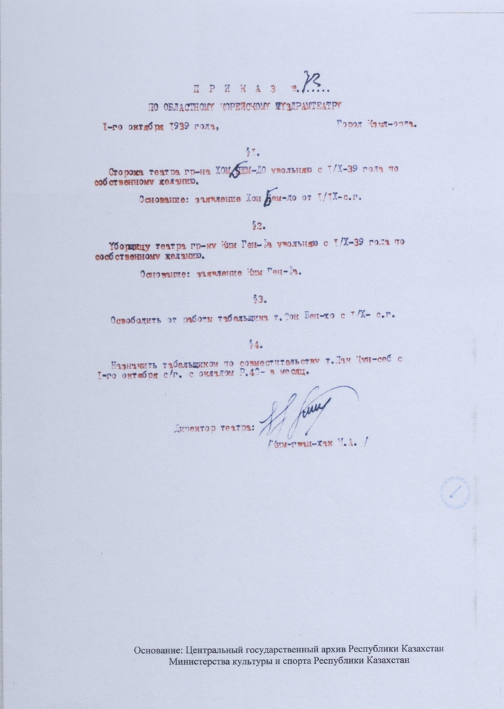 고려극장 해임 지령서는 스탈린의 한인 강제이주 정책으로 인해 카자흐스탄에 정착해 크즐오르다 한인공연예술극장에서 수위로 일하던 71세의 장군을 1939년 10월 1일 본인 요청에 따라 해임한다는 내용을 담고 있다.