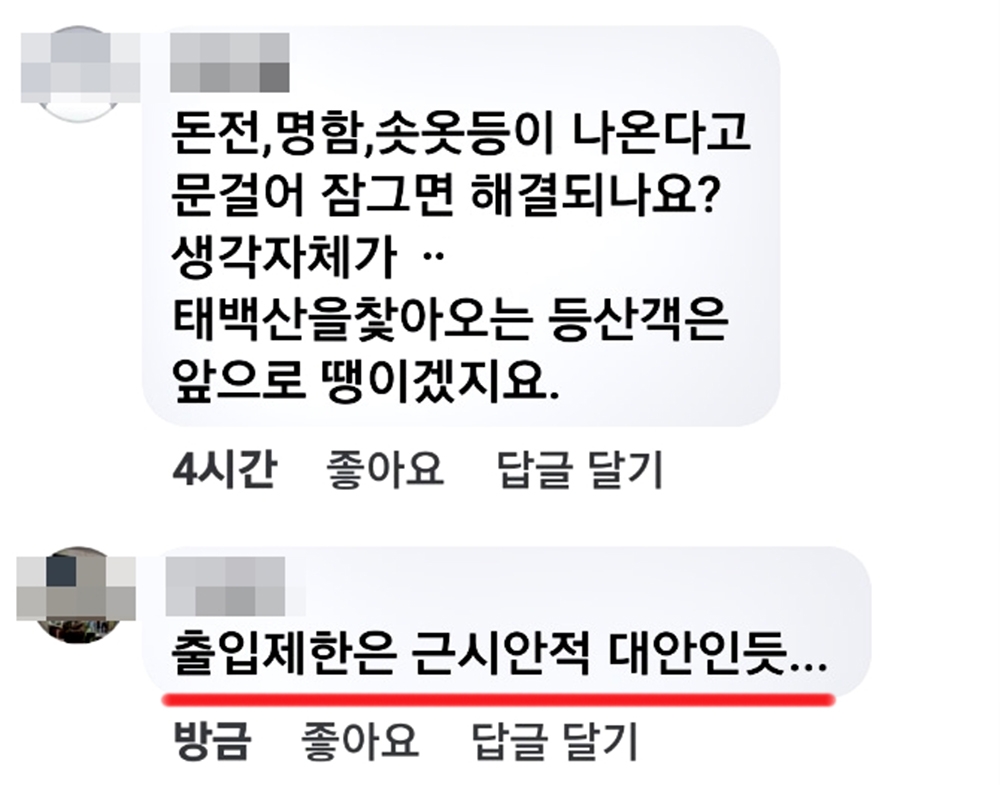 누리꾼들은 "몇몇 잘못으로 태백산에 오르는 다수의 행복을 빼앗는 근시안적 대안"이라고 지적했다.
