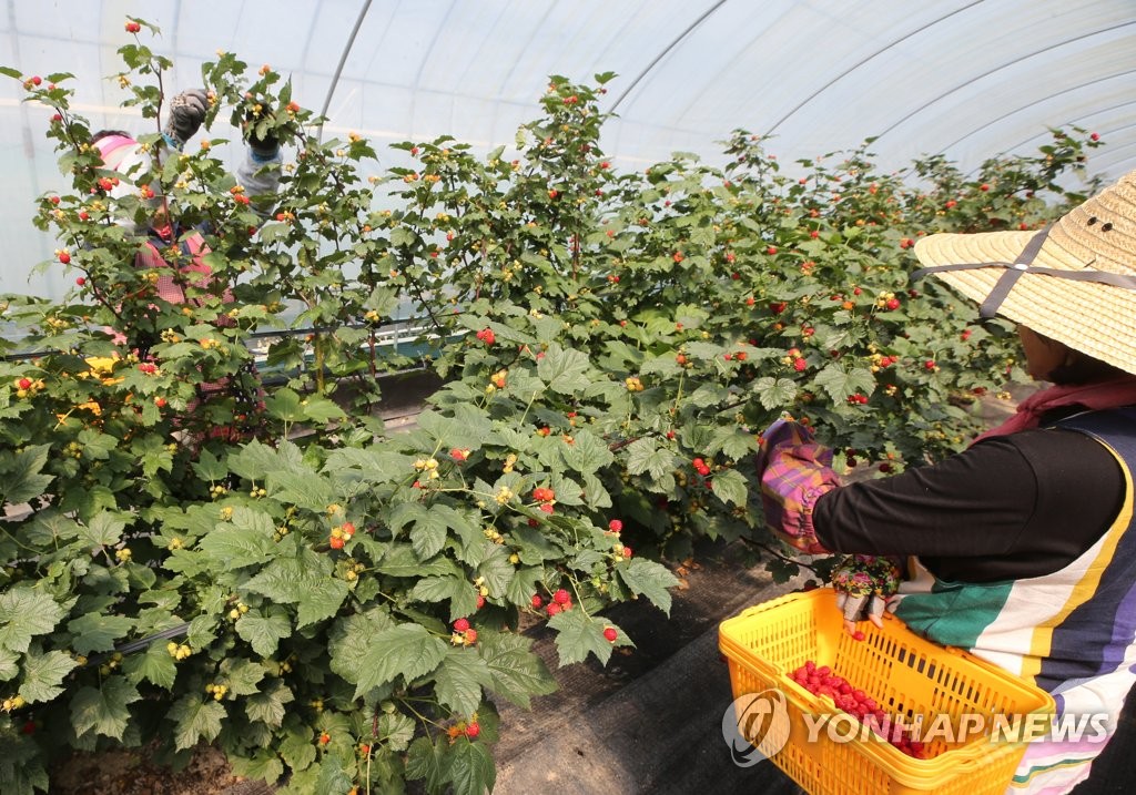 (김해=연합뉴스) 10일 경남 김해시 상동면 여차리 산딸기 농장에서 농민들이 잘 익은 산딸기를 수확하고 있다.