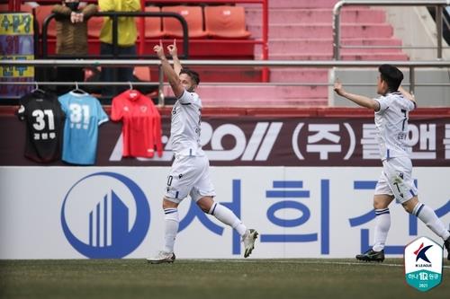 | ▲ Elias Aguilar of Incheon United (L) celebrates his goal against Pohang Steelers during a K League 1 match at Pohang Steel Yard in Pohang, 370 kilometers southeast of Seoul, on Feb. 28, 2021, in this photo provided by the Korea Professional Football League. (PHOTO NOT FOR SALE) (Yonhap) |