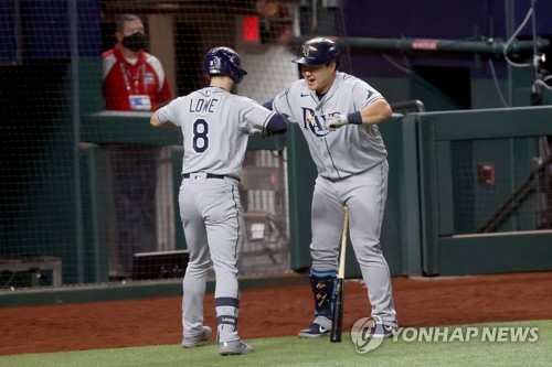 | ▲ 2점 홈런 친 브랜던 로와 함께 세리머니를 펼치는 최지만 [게티이미지/AFP=연합뉴스] |