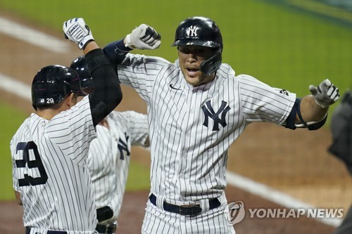 | ▲ 포스트시즌 5경기 연속 홈런 터트린 양키스 스탠턴(오른쪽) [AP=연합뉴스] |