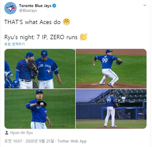 토론토 구단은 트위터 계정에서 "이것이 바로 에이스가 하는 일"이라며 류현진의 역투를 극찬했다.