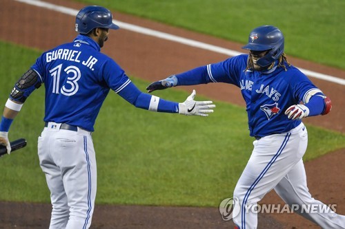 | ▲ 선제 솔로 홈런 친 블라디미르 게레로 주니어(오른쪽) [AP=연합뉴스] |