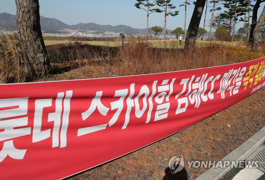 | ▲ 롯데스카이힐 김해CC에 걸린 불매운동 현수막 (김해=연합뉴스) 이정훈 기자 = 20일 경남 김해시 진례면 롯데스카이힐 김해CC에 회원들이 내건 롯데CC 매각반대·불매운동 현수막이 걸려 있다. 2023.2.20 seaman@yna.co.kr |