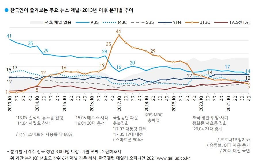 | ▲ 한국갤럽 '한국인이 즐겨보는 뉴스채널' 조사 분기별 추이 [한국갤럽 제공. 재판매 및 DB 금지] |