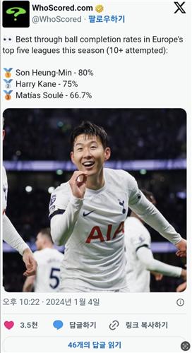 5일(이하 한국시간) 축구 통계 사이트 후스코어드닷컴은 사회관계망서비스(SNS)를 통해 2023-2024시즌 유럽 5대 리그에서 스루패스 성공률이 가장 높은 선수 3명을 공개했는데 손흥민이 80%로 당당히 1위에 올랐다.