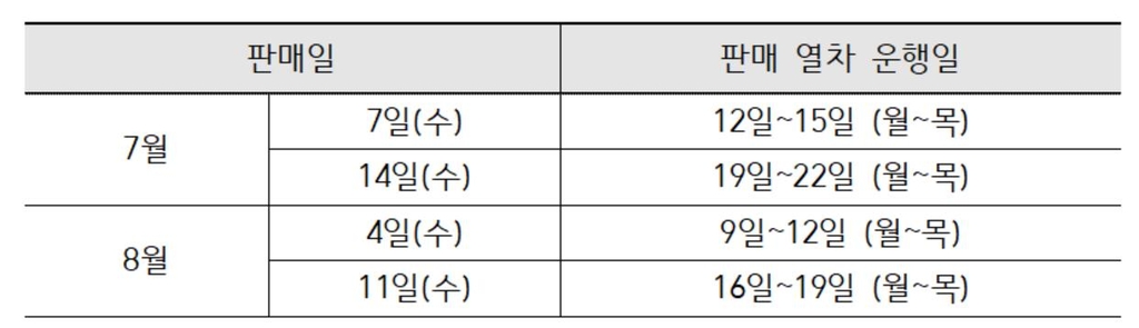 특가 승차권은 운행 전주 수요일(이달 7·14일과 다음 달 4·11일) 오전 11시부터 오후 6시까지 예매한다.