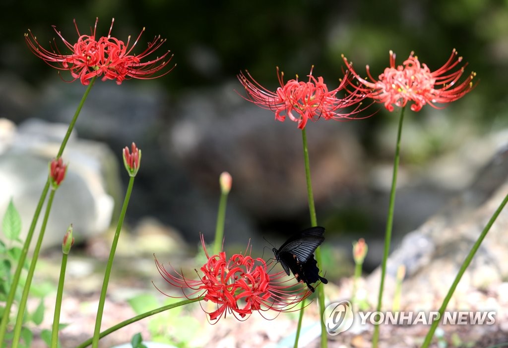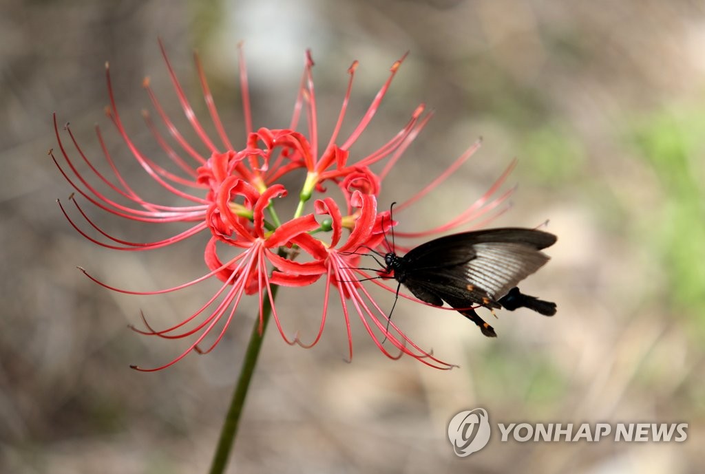 | ▲ 가을 맞이 나선 제비나비; (여수=연합뉴스) 형민우 기자 = 9일 오전 전남 여수시 중흥동 흥국사에서 제비나비가 꽃망울을 활짝 터뜨린 꽃무릇 위에 앉아 한가로운 시간을 보내고 있다. 9월 초부터 피는 꽃무릇은 잎이 진 후에 꽃이 피고 꽃이 져야 다시 잎이 나기 때문에 잎과 꽃이 서로 만나지 못하고 그리워만 한다는 사연으로 일명 '상사화(相思花)'로도 불린다. 2021.9.9 minu21@yna.co.kr |
