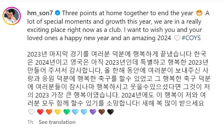 이날 경기 사진을 함께 올린 손흥민은 "올 한해 여러분이 보내주신 사랑과 응원 덕분에 행복한 축구를 할 수 있었고, 그 행복한 축구 덕분에 여러분들이 잠시나마 행복하시고 웃을 수 있으셨다면 그것이 저의 2023 가장 큰 행복이었습니다"라고 강조했다.