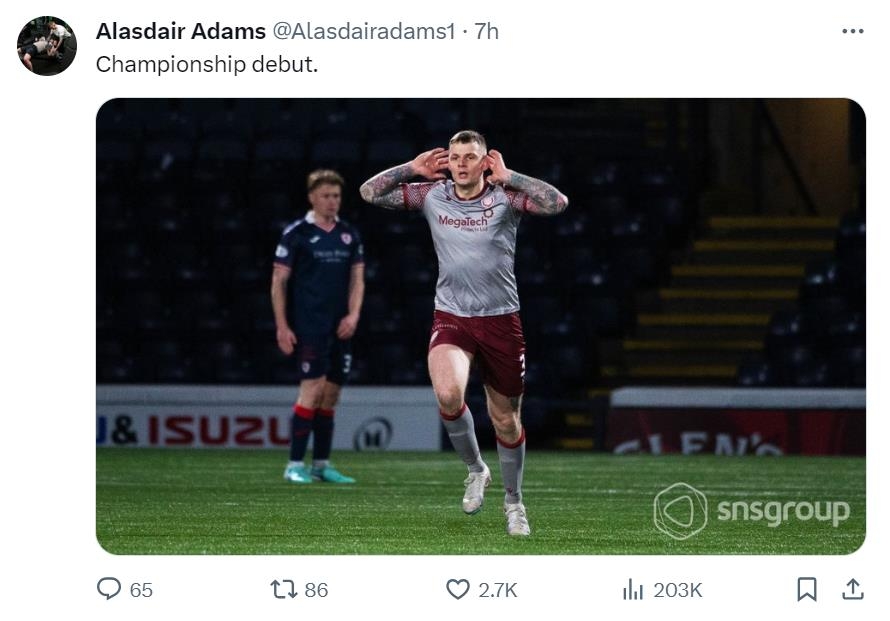 | ▲ SNS를 통해 자신의 스코틀랜드 챔피언십 데뷔골을 자축한 알리 애덤스 [알리 애덤스 X 캡처. 재판매 및 DB 금지] |