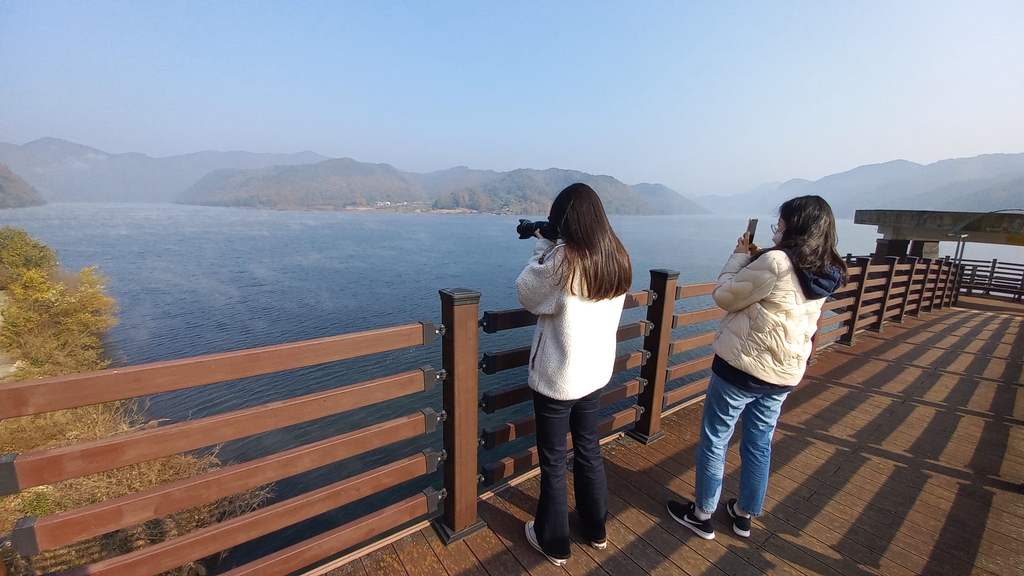 충북 옥천의 대청호 연안 산책로인 '향수호수길'을 걷자면 늦은 아침까지 호수를 뒤덮은 물안개를 볼 수 있다.
