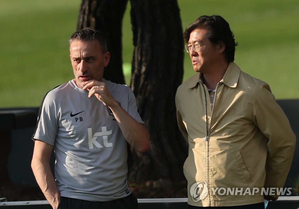 | ▲ 피울루 벤투 감독과 이야기를 나누는 김판곤 전 축구협회 전력강화위원장 [연합뉴스 자료사진] |