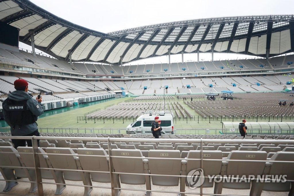 | ▲ Security officials check seats at Seoul World Cup Stadium in western Seoul on Aug. 11, 2023, hours before the "K-pop super live concert" to be attended by about 40,000 participants of the 2023 World Scout Jamboree. (Yonhap) |