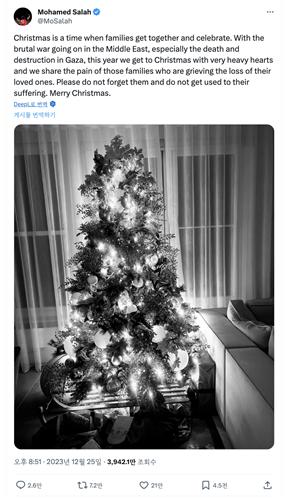 살라흐는 성탄절인 25일 X(옛 트위터)에서 "중동에서 벌어지는 잔인한 전쟁, 특히 가자지구의 죽음과 파괴로 인해 우리는 매우 무거운 마음으로 크리스마스를 맞이하고 있다"면서 "사랑하는 가족을 잃고 슬퍼하는 사람들의 아픔을 함께 나누겠다"고 적었다.