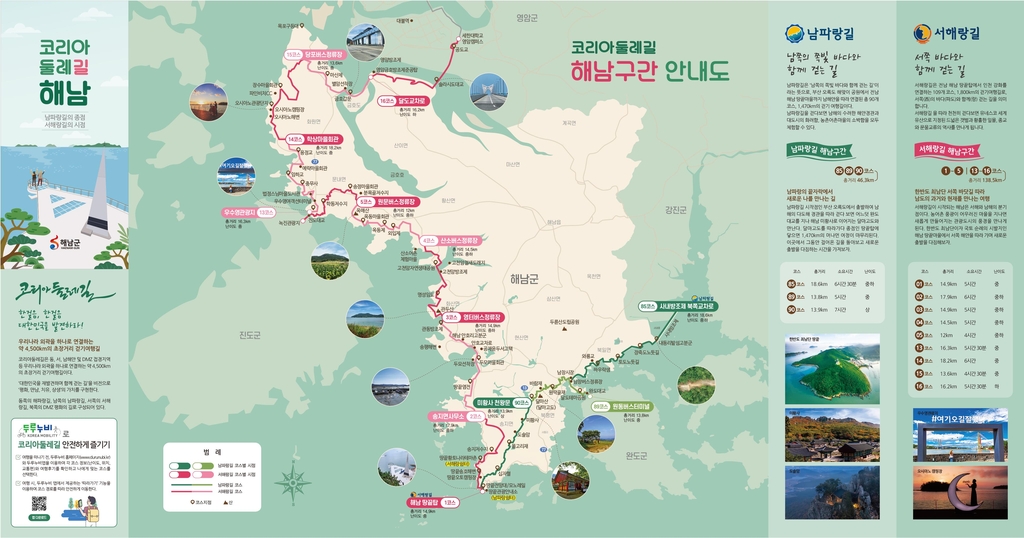 전남 해남군은 17일 코리아 둘레길 걷기 여행객의 편의 제공을 위해 해남 구간 지도를 발행했다고 밝혔다.