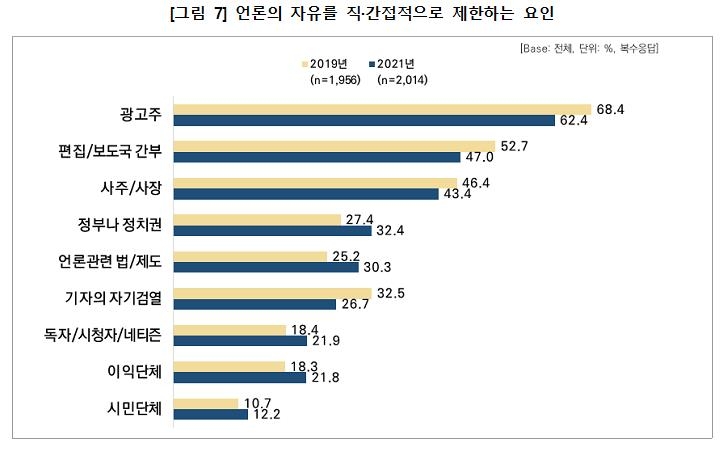 언론인들은 언론 자유를 직·간접으로 제한하는 가장 큰 요인으로 광고주(62.4%)를 꼽았으며 다음으로 편집·보도국 간부(47.0%), 사주·사장(43.4%) 순이었다.