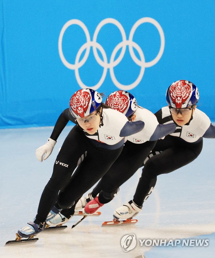 | ▲ South Korean short track speed skater Lee Yu-bin (L) leads her teammates during a training session at Capital Indoor Stadium in Beijing on Feb. 1, 2022, in preparation for the Beijing Winter Olympics. (Yonhap) |