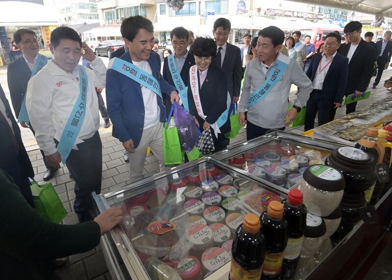 이후 주문진 건어물 상가와 수산시장을 돌면서 관광객에게 수산물 소비 홍보 리플릿을 나눠주기도 했다.