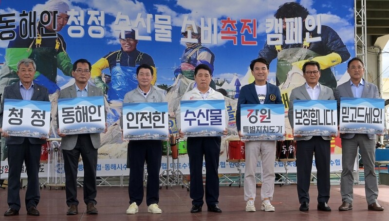 이날 캠페인에는 권혁열 도의회 의장을 비롯한 도의원, 동해안 6개 시군 수협, 어업인과 소상공인 단체 등 600여 명이 동참했다.