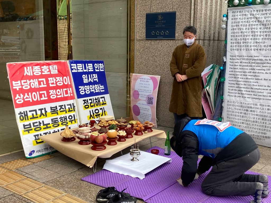 코로나19로 일자리를 잃은 서울 중구 세종호텔 해고 노동자들은 "거리두기가 해제돼 관광객이 늘고 매출이 증가했지만, 호텔은 여전히 비정규직 노동자를 고용해 객실을 운영하고 있다"며 복직을 요구했다.